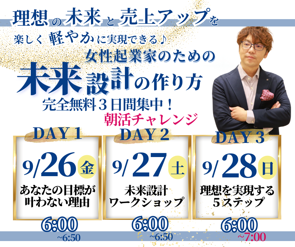 1〜3日目を通して学んでいくことで、あなたは理想の未来も、目標売上も、実現できる可能性が飛躍的に高まります。